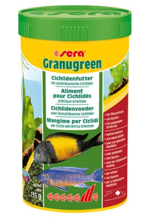 Sera granugreen Nature ist ein schonend hergestelltes Hauptfutter ohne Farb- und Konservierungsstoffe, speziell für vorwiegend pflanzen- und aufwuchsfressende, kleinere Cichliden wie viele ostafrikanische Buntbarscharten. Hochwertige pflanzliche Zutaten wie Spirulina-Algen und Spinat liefern einen hohen Anteil natürlicher Carotinoide, die eine optimale Farbentwicklung fördern. Die ausgewogene Rezeptur unterstützt eine kraftvolle Entwicklung sowie eine gesunde Verdauung. Das langsam sinkende Granulat ist formstabil und belastet das Aquariumwasser nicht.