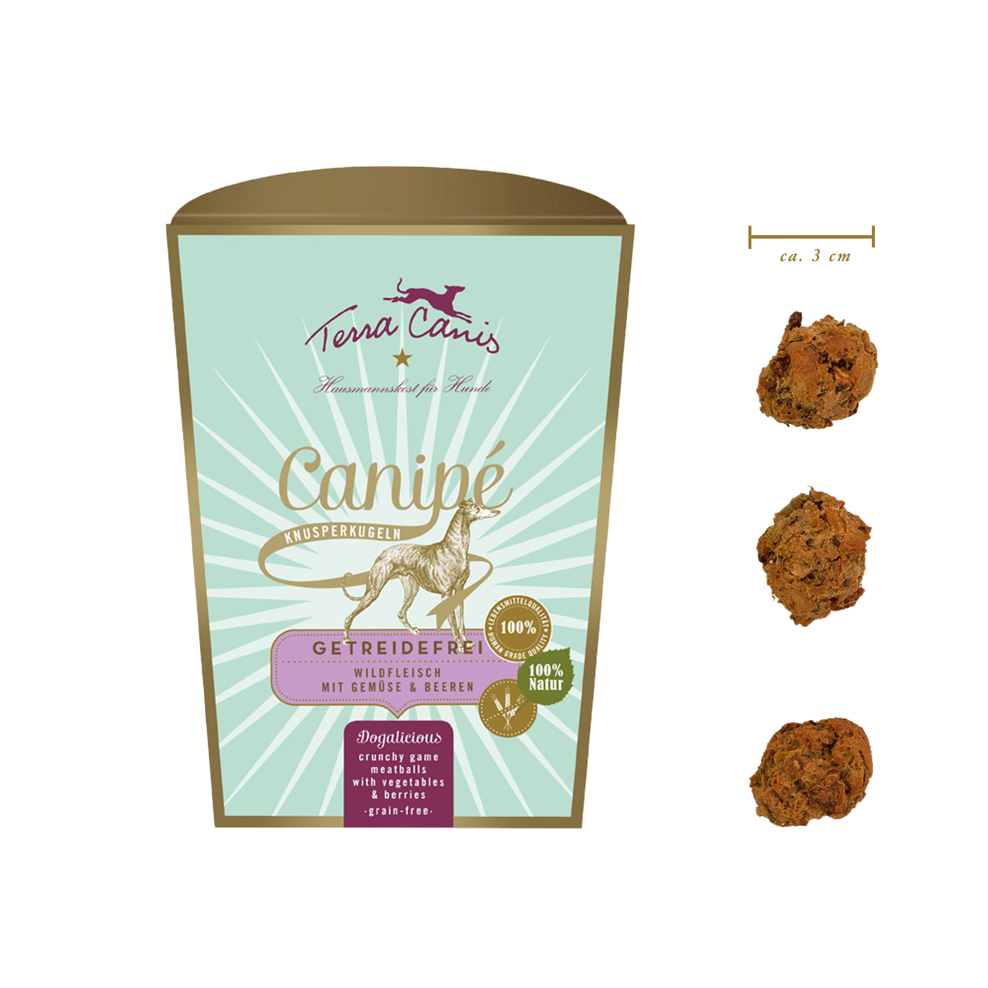 Die Canipé Knusperkugeln mit Reh & Hirsch von Terra Canis vereinen feinsten Wildgeschmack mit gesunden pflanzlichen Zutaten – komplett getreidefrei und in echter Lebensmittelqualität. Hergestellt in einer kleinen deutschen Manufaktur, entstehen diese einzigartigen Hundesnacks in handwerklicher Verarbeitung und ohne künstliche Zusätze. Die Kombination aus frischem Wildmuskelfleisch, Süsskartoffel, Gemüse und Heidelbeeren macht diesen Snack zu einer idealen Wahl für ernährungssensible Hunde. Jede Kugel ist individuell und authentisch – wie hausgemacht und unverwechselbar im Geschmack.