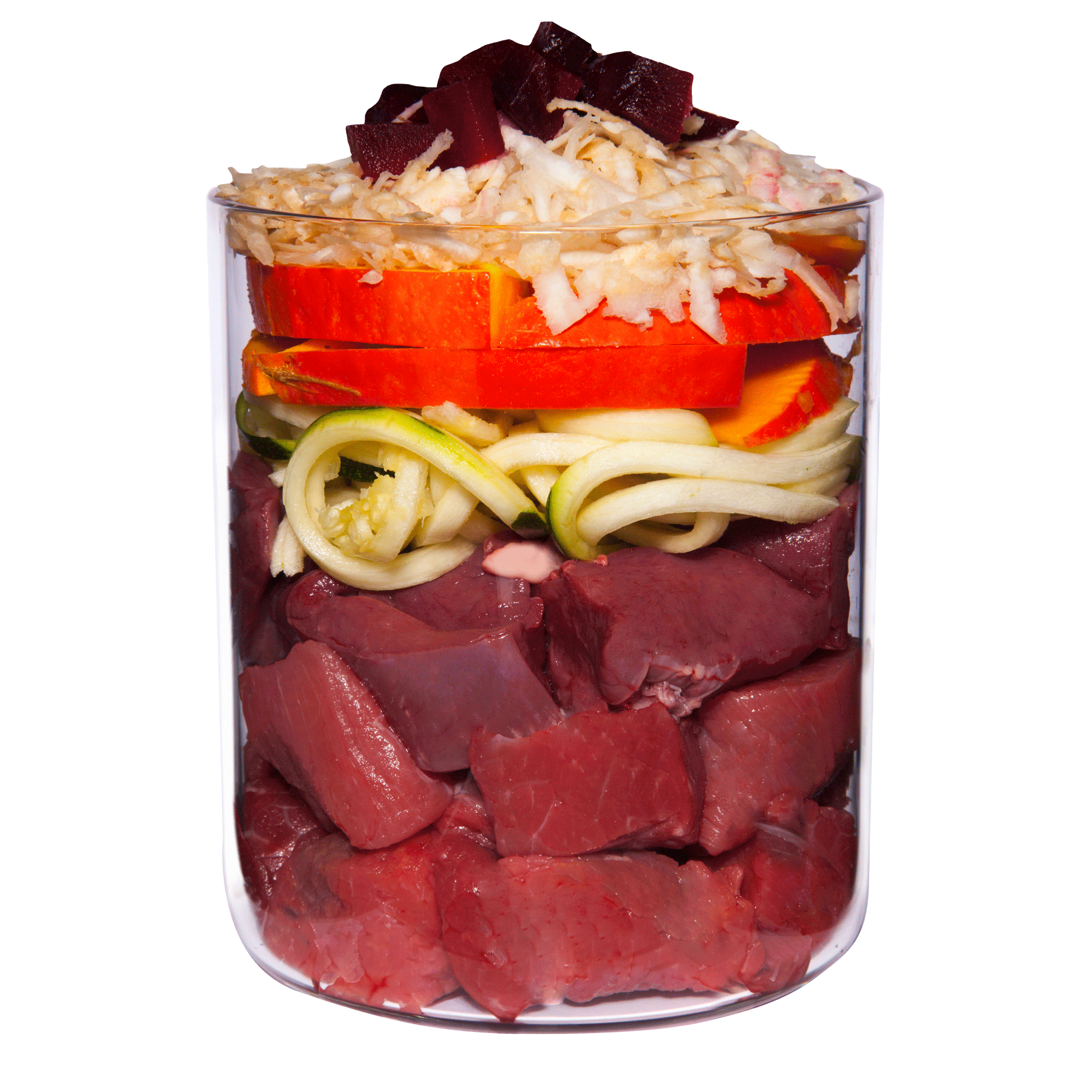 Herzmuskelfleisch vom Rind (43 %), Kürbis (15 %), Rinderlunge (11 %), Zucchini (9 %), Muskelfleisch vom Rind (5 %), Pastinake, Rote Bete, Kokosmehl, Rapsöl, Kürbiskernmehl, Austernschale, Bierhefe, Basilikum, Flohsamen, Andensalz, Oregano (0,1 %), Mineralerde, Petersilie, Blütenpollen, Seealge, Mineralstoffe (alle getrocknet)