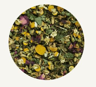 Kamillenblüten, Schafgarbenblüten, Melissenblätter, Anis, Hamamelisblätter, Schwarzkümmel, Rosenblüten rot, Malvenblätter, Bachblüten-Essenz (Holly, Beech, Sweet Chestnut, White Chestnut, Centaury, Chicory, Honeysuckle).