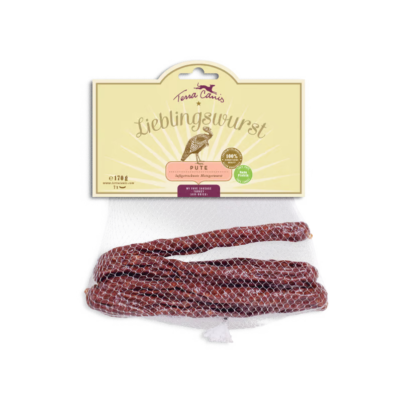 Die Terra Canis Lieblingswurst Pute ist ein hochwertiger, getreidefreier Snack, der aus 100 % echter Lebensmittelqualität besteht. Hergestellt aus Muskelfleisch und Herz von Pute, wird diese schonend luftgetrocknete Wurst von Hunden besonders wegen ihres intensiven Aromas und der zarten Konsistenz geschätzt. Ideal als Belohnung beim Training oder als schmackhafter Snack für zwischendurch – ohne Zusatzstoffe oder Getreide. Ein Monoprotein-Produkt, das speziell für empfindliche Hunde geeignet ist.