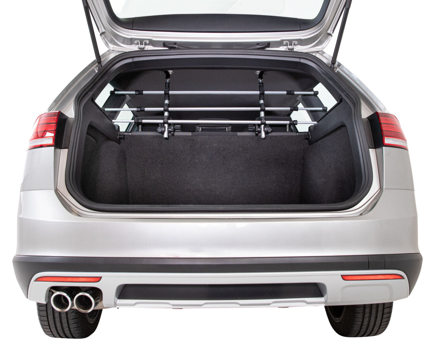 Das Gitter wird mit dem Spannmechanismus zwischen Boden und Dach befestigt. Höhe und Breite lassen sich flexibel an das Fahrzeug anpassen. Die Montage erfolgt werkzeugfrei und ohne bleibende Spuren.