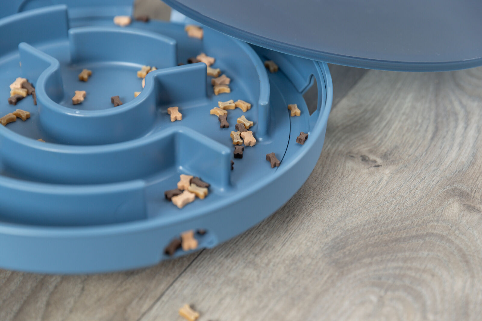 Einfach mit Trockenfutter oder Snacks befüllen. Der Hund lernt durch Bewegung und Konzentration, sich die Leckerlis zu erarbeiten – ideal zur geistigen Auslastung bei schlechtem Wetter oder im Alltag.