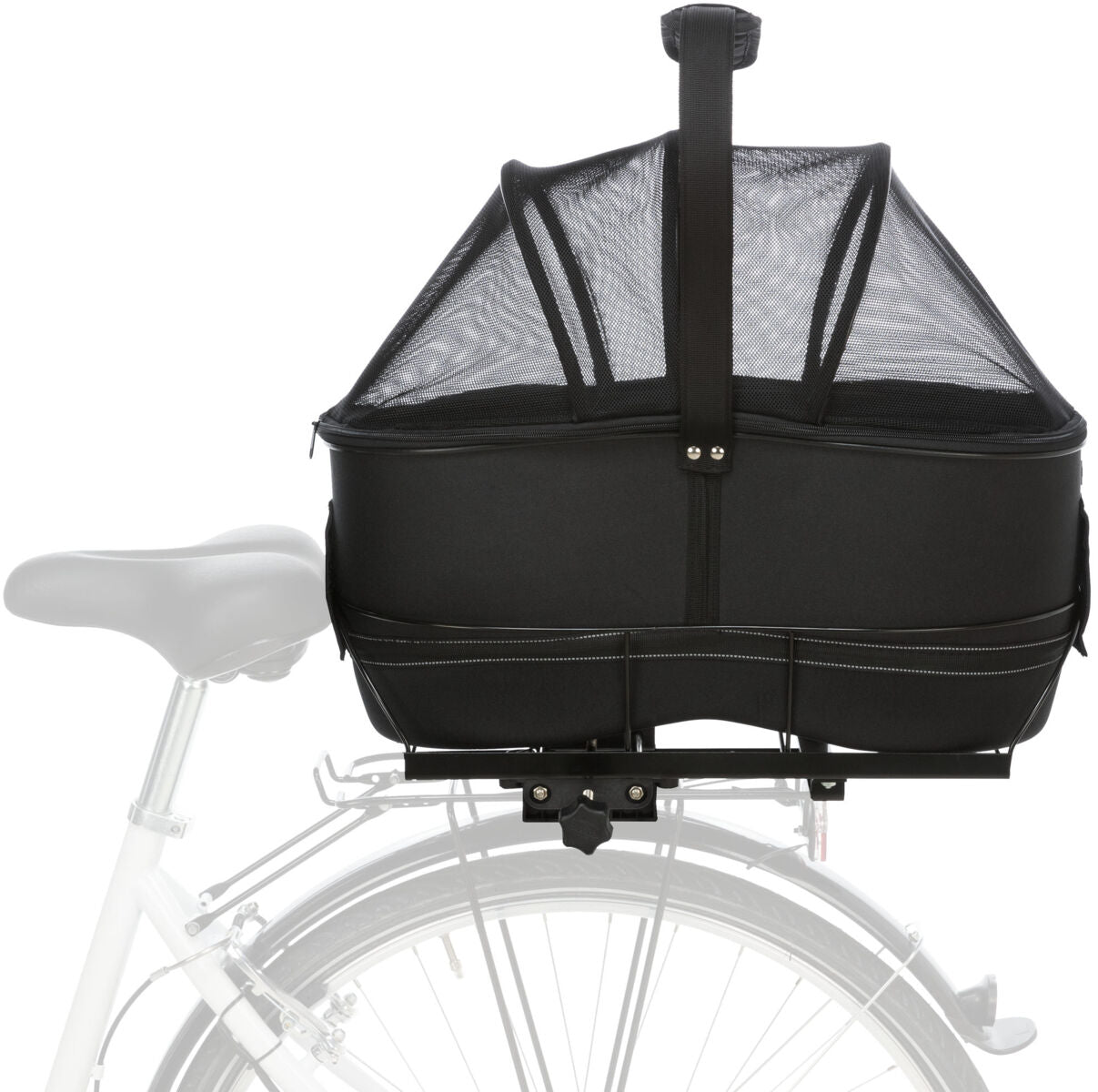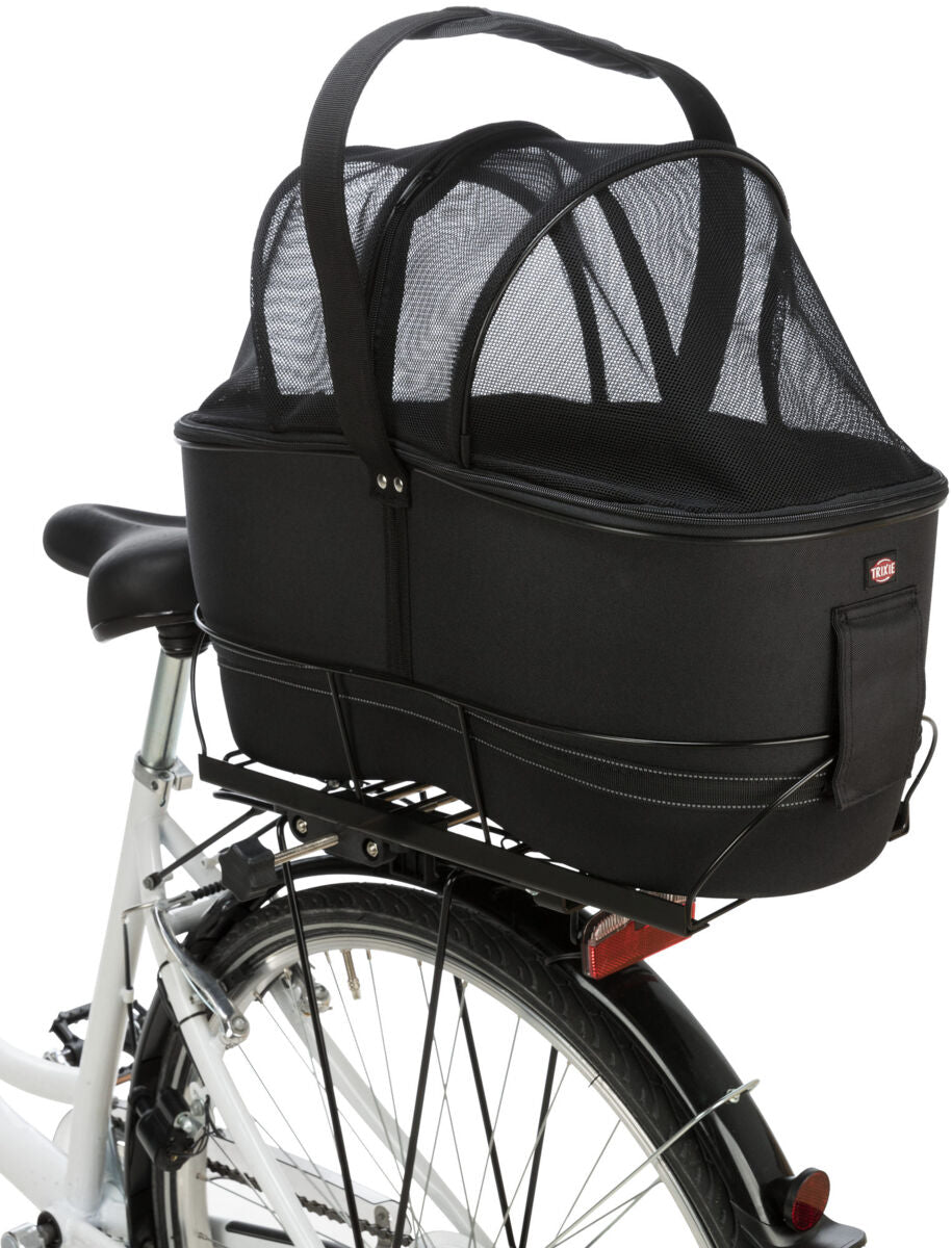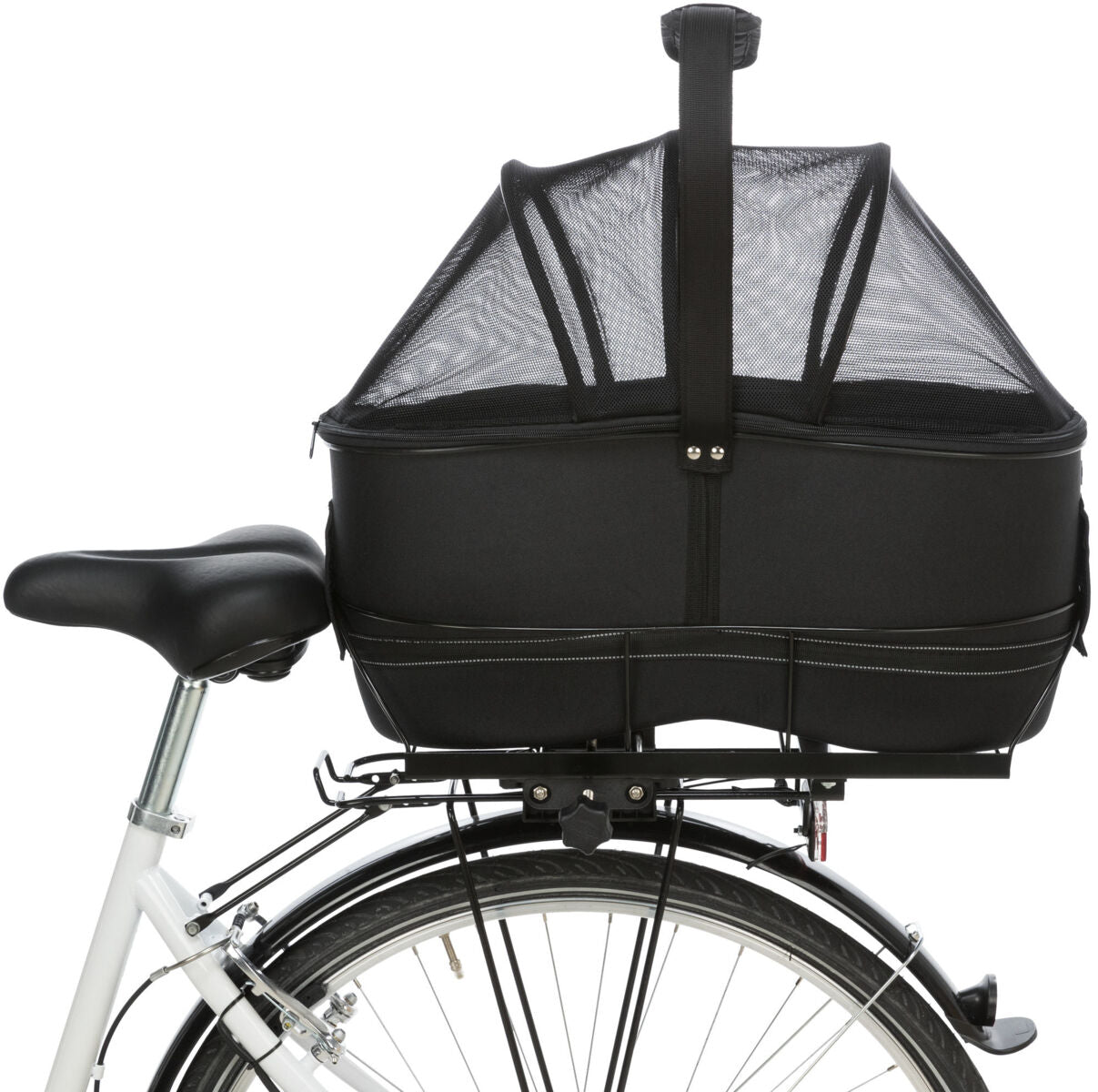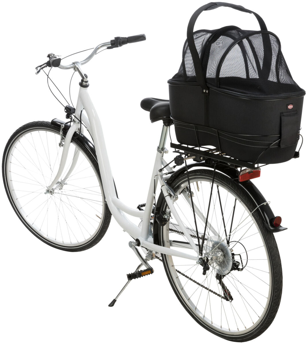 Der Korb wird mit dem mitgelieferten Montagesystem sicher auf breiten Gepäckträgern (z. B. bei E-Bikes) befestigt. Das Gitter verhindert das Herausspringen und lässt sich bei Bedarf abnehmen. Perfekt für sichere Fahrten mit deinem Vierbeiner.