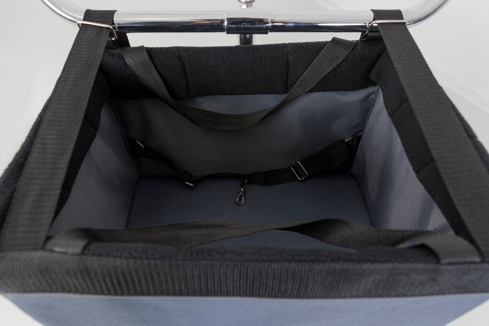 Die Trixie Front-Box für Fahrräder in elegantem Grau ist die perfekte Lösung, um deinen kleinen Hund sicher und komfortabel auf Radtouren mitzunehmen. Sie wird stabil am Lenker befestigt und sorgt durch verstärkte Form, gepolsterten Innenraum und integrierte Kurzleine für einen sicheren Halt. Reflektierende Elemente erhöhen die Sichtbarkeit im Strassenverkehr. Die Box verfügt über praktische Seitentaschen und einen Schultergurt, wodurch sie sich auch ideal als Tragetasche für unterwegs nutzen lässt – ideal für Alltag, Stadt und Ausflüge ins Grüne.