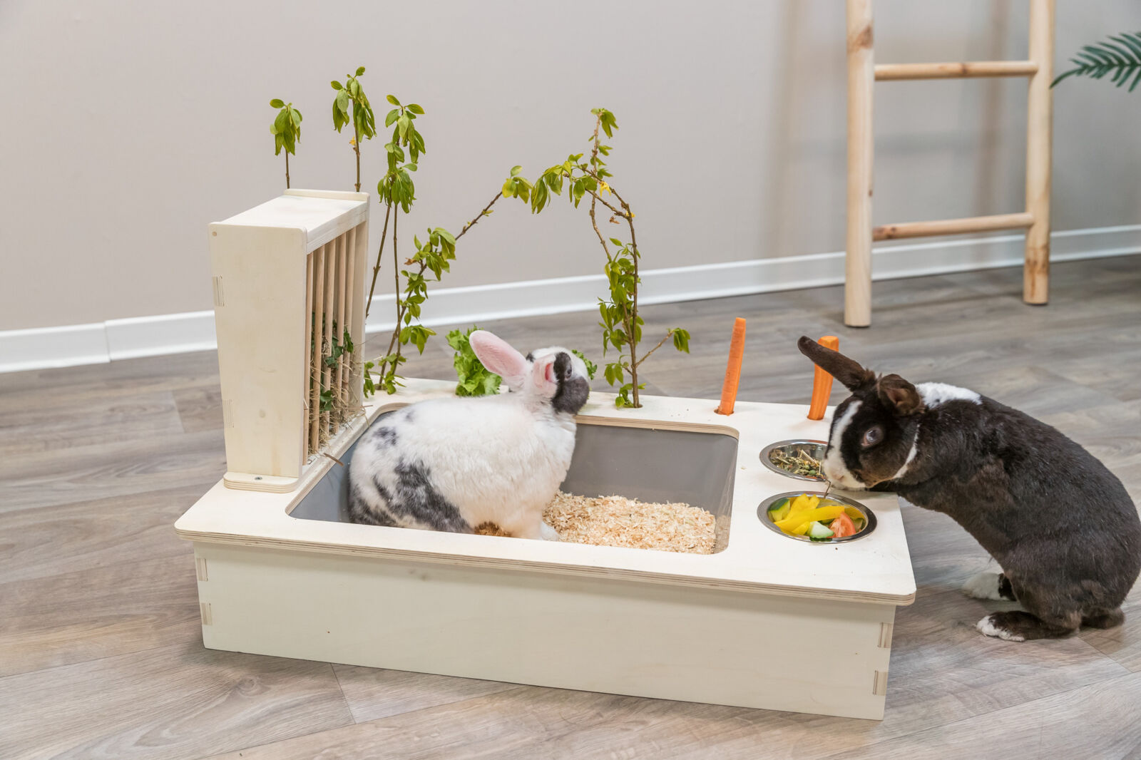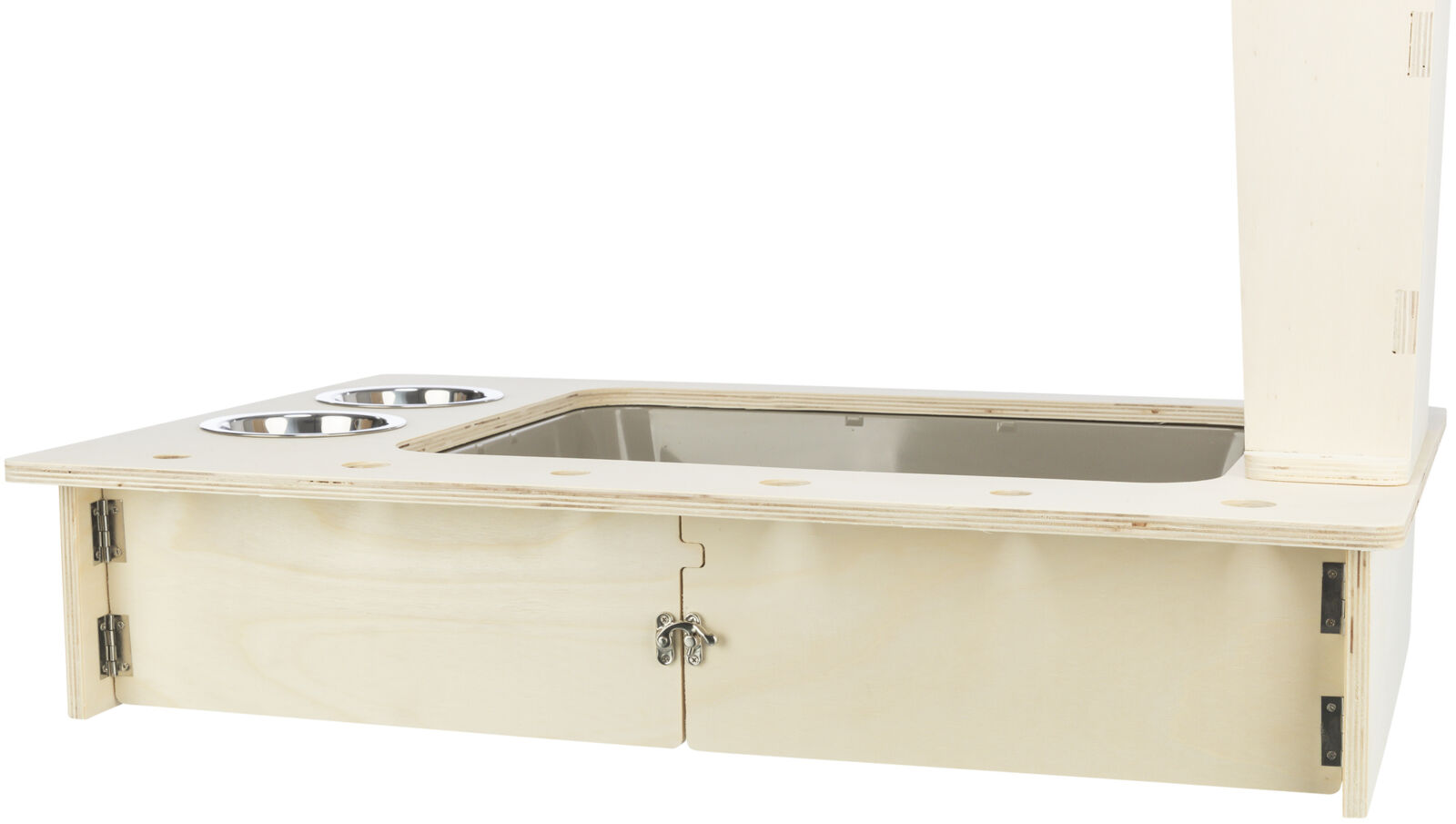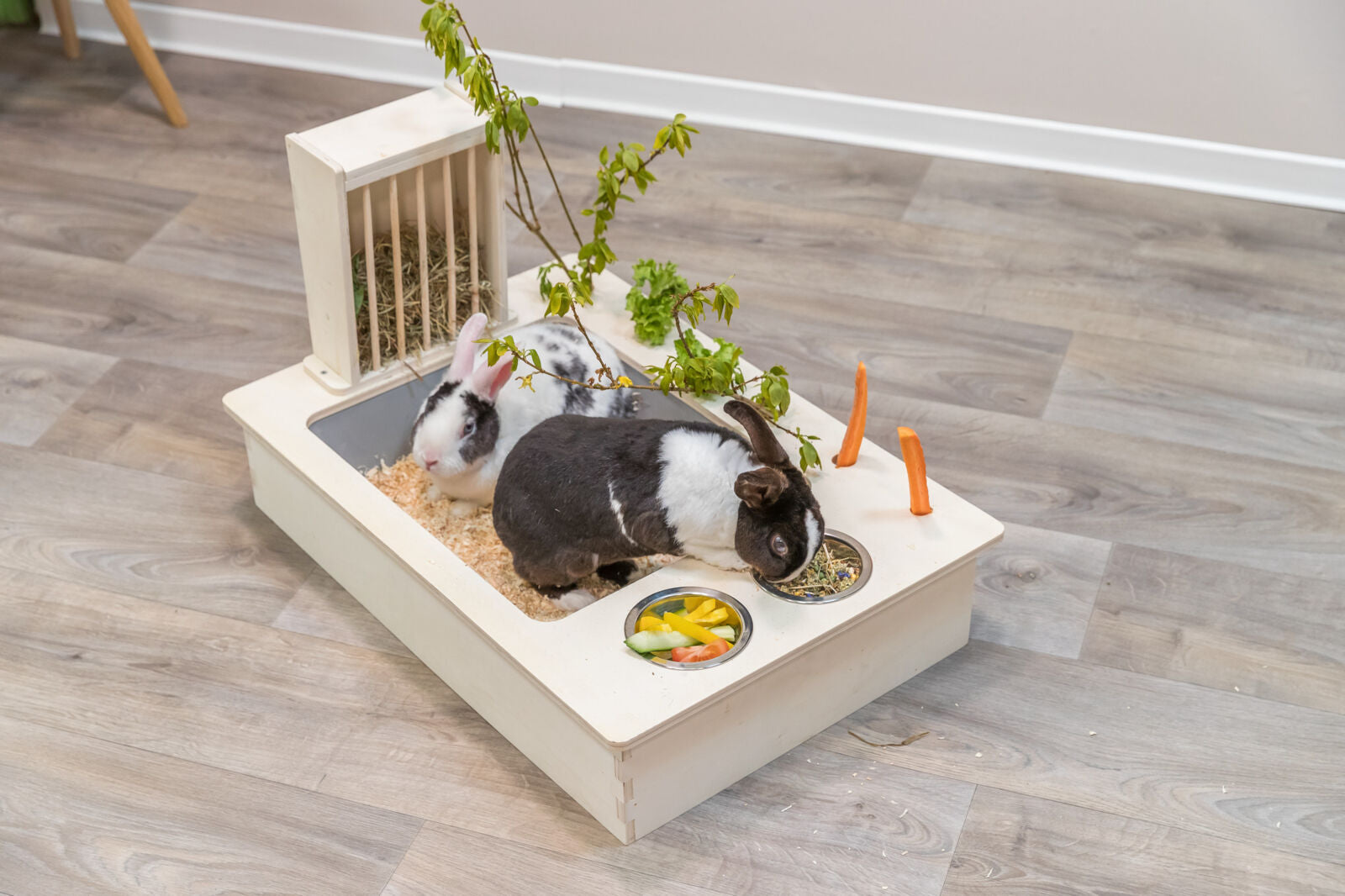 Die Futterstation von Trixie aus unbehandeltem Holz kombiniert zwei Edelstahlnäpfe mit einer praktischen Heuraufe. Zusätzliche Öffnungen ermöglichen das Einlegen von Zweigen oder Gemüse, um die natürliche Fütterung zu unterstützen. Die herausnehmbare Toilettenwanne aus Kunststoff erleichtert die Reinigung. Dieses artgerechte Futterzubehör wurde von einer unabhängigen Fachstelle für tiergerechte Tierhaltung und Tierschutz geprüft und ist ideal für Nagetiere geeignet.