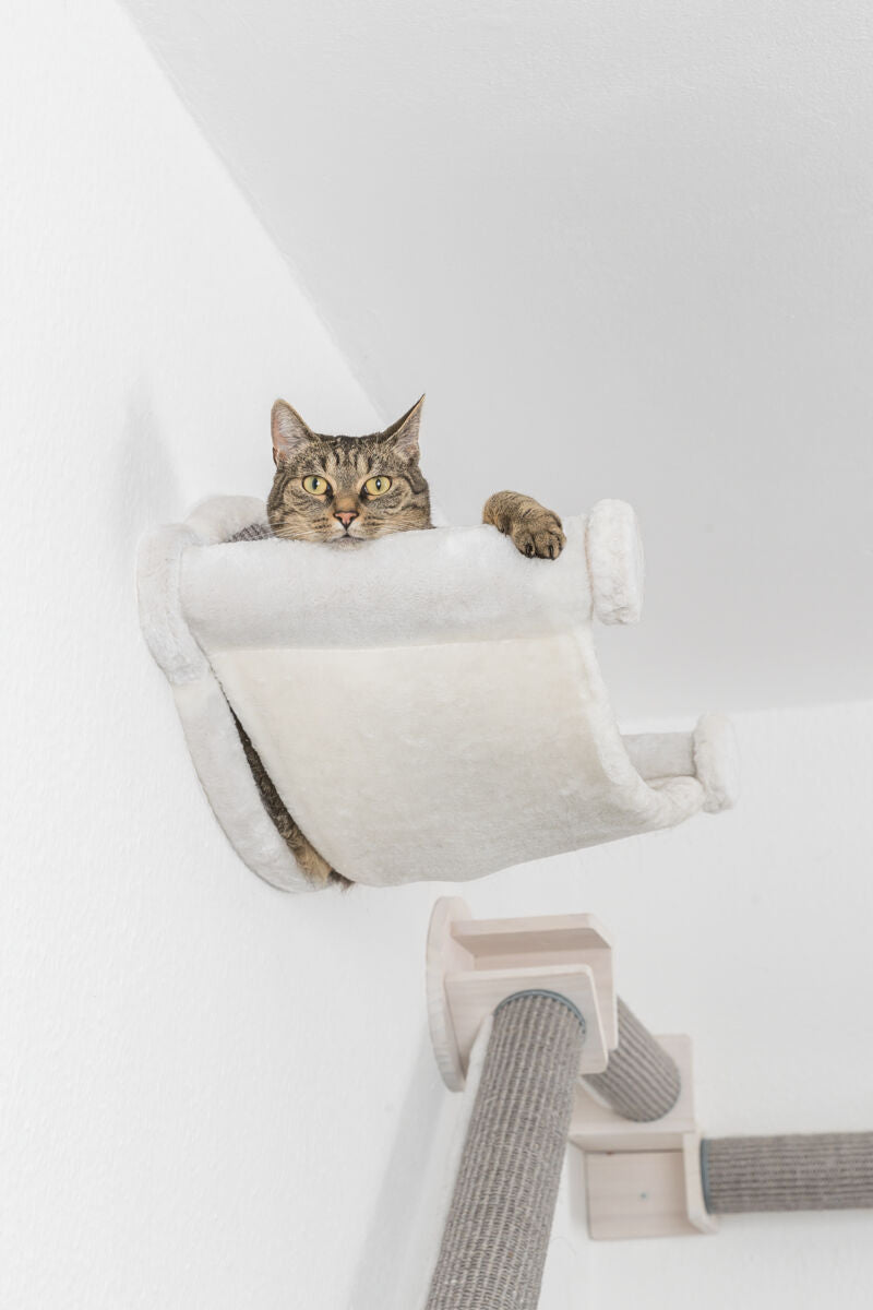 Die Hängematte wird direkt an der Wand befestigt und ist ideal für aktive Katzen, die erhöhte Rückzugsorte lieben. Perfekt kombinierbar mit anderen Kletterelementen.