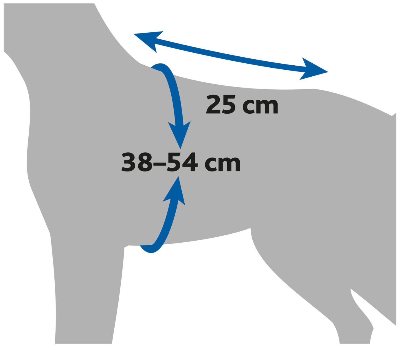 Verstellbare Klettverschlüsse an Brust und Bauch – für Halsumfänge ca. 30–60 cm