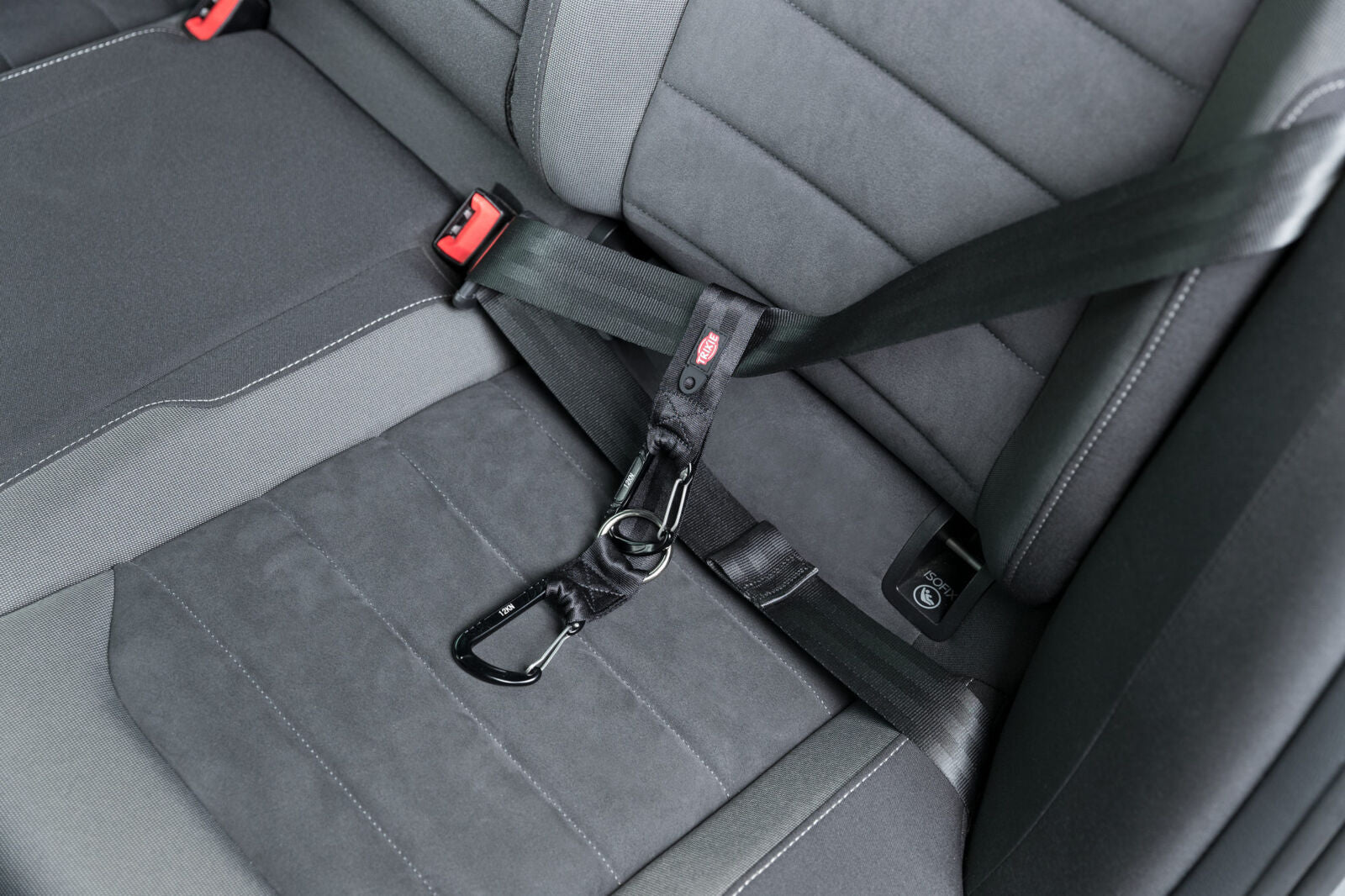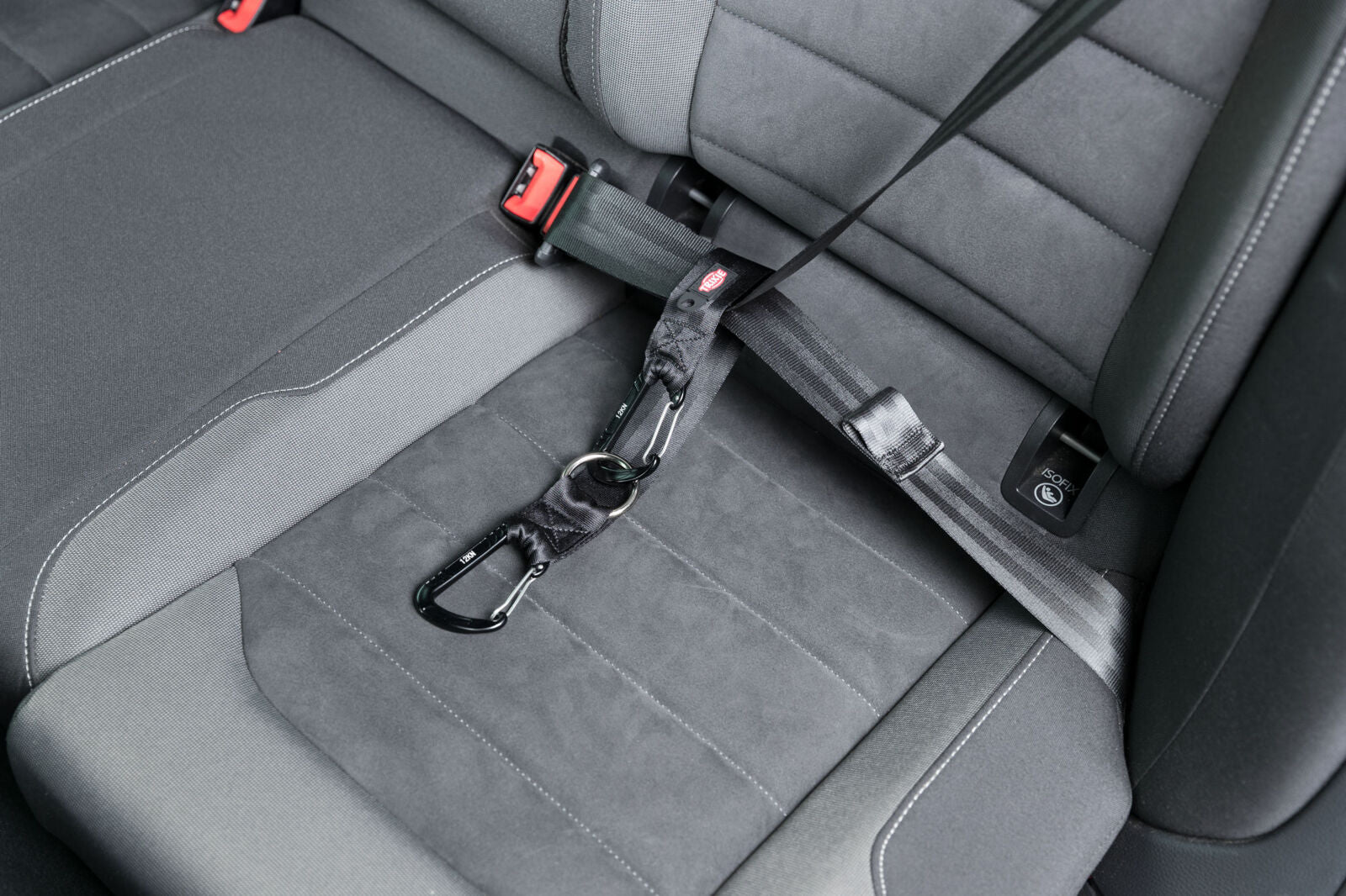 Hake den Karabiner an das Hundegeschirr oder -halsband, führe das Gurtband um den Autosicherheitsgurt oder Haltegriff und schließe es mit dem Karabiner. So bleibt dein Hund während der Fahrt sicher an seinem Platz.